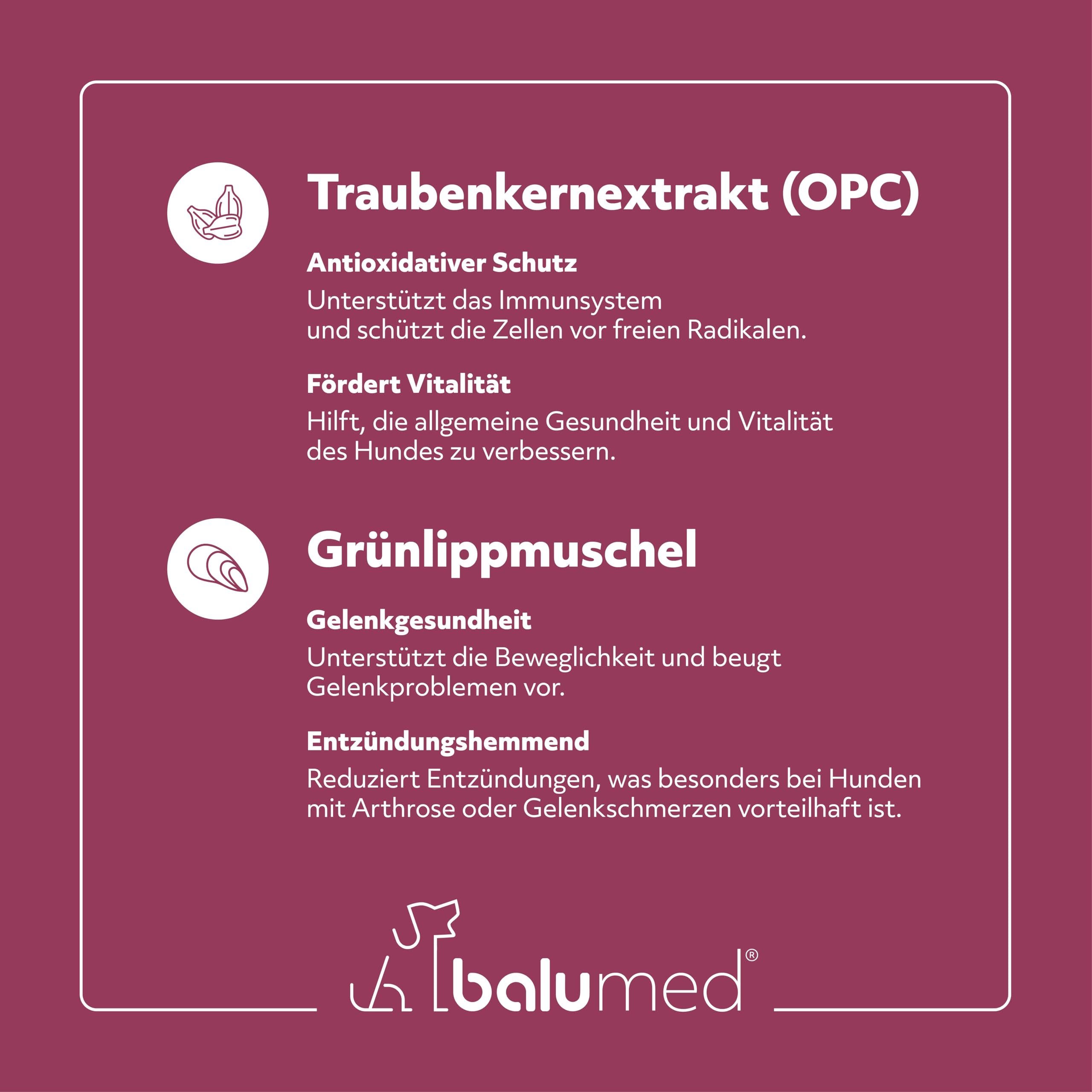VITALITÄT – Das im Traubenkernextrakt enthaltene OPC kann besonders vor freien Radikalen und antioxidativem Stress schützen und somit die Vitalität deines geliebten Vierbeiners begleiten.
