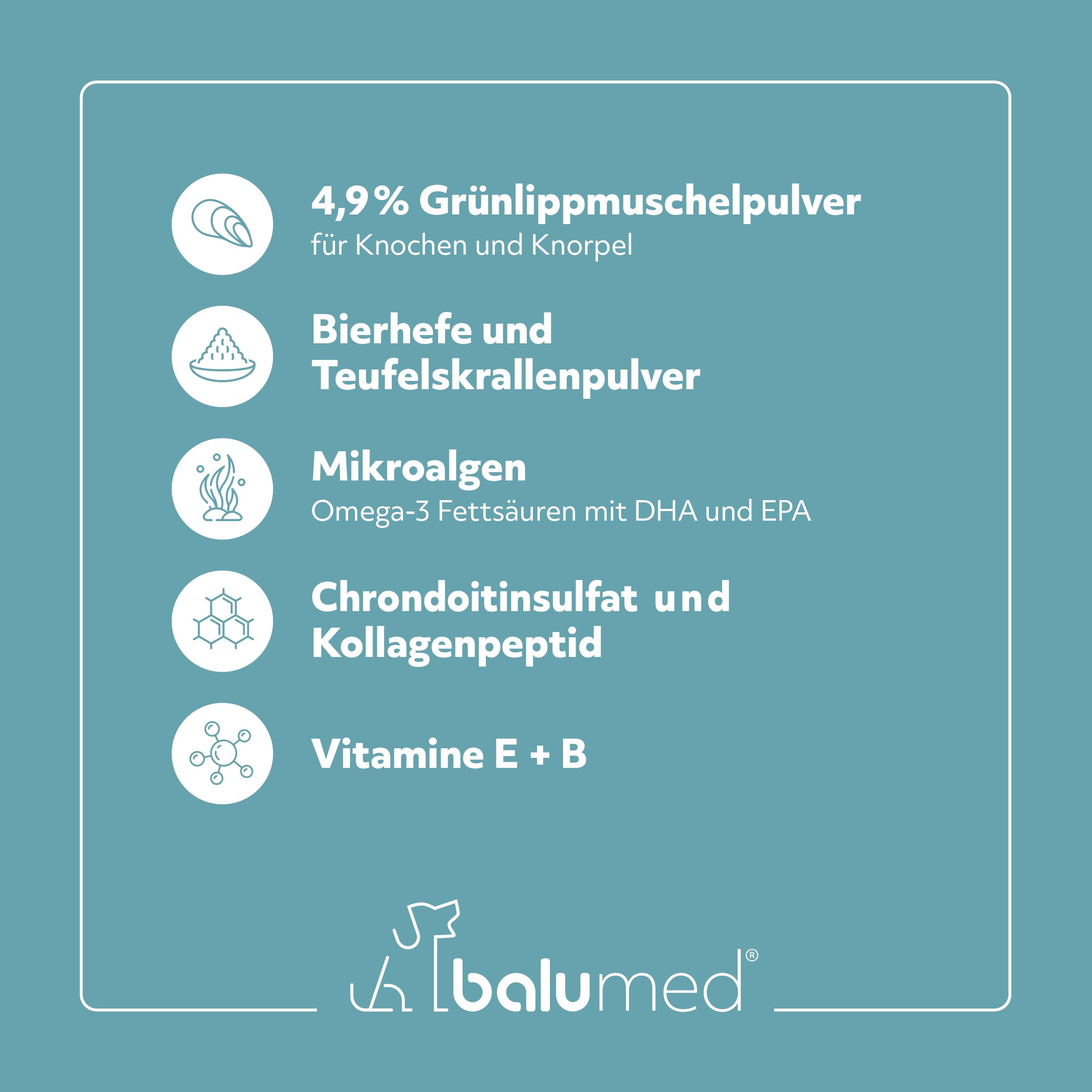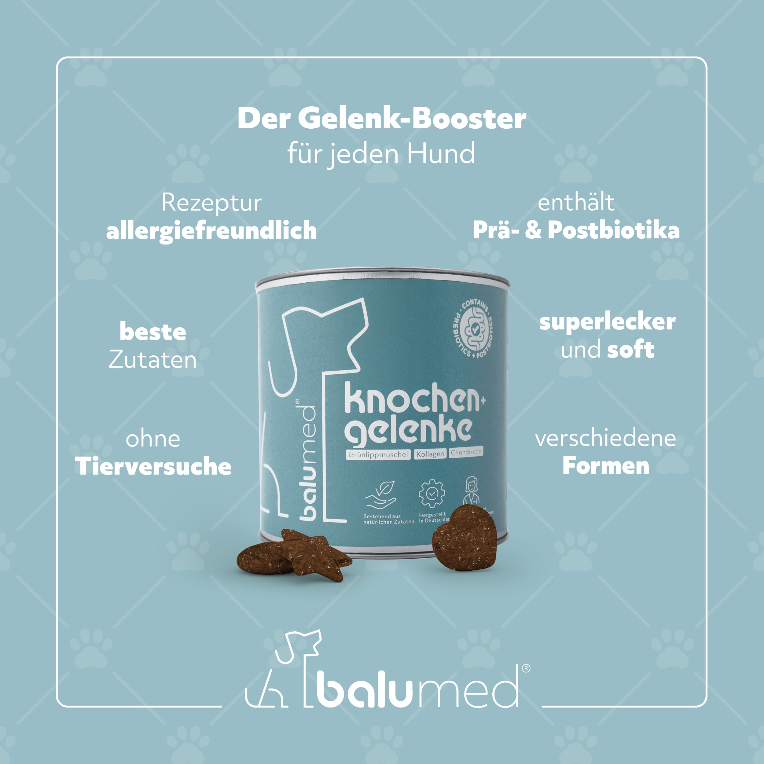 - KNOCHEN und GELENKE: balumed Snacks Knochen+Gelenke für Hunde mit innovativem und mehrschichtigem Inhaltsstoffkomplex begleiten auf natürliche Weise starke Knochen, Knorpel und Gelenke sowie ein intaktes System. Für glückliche Pfoten!